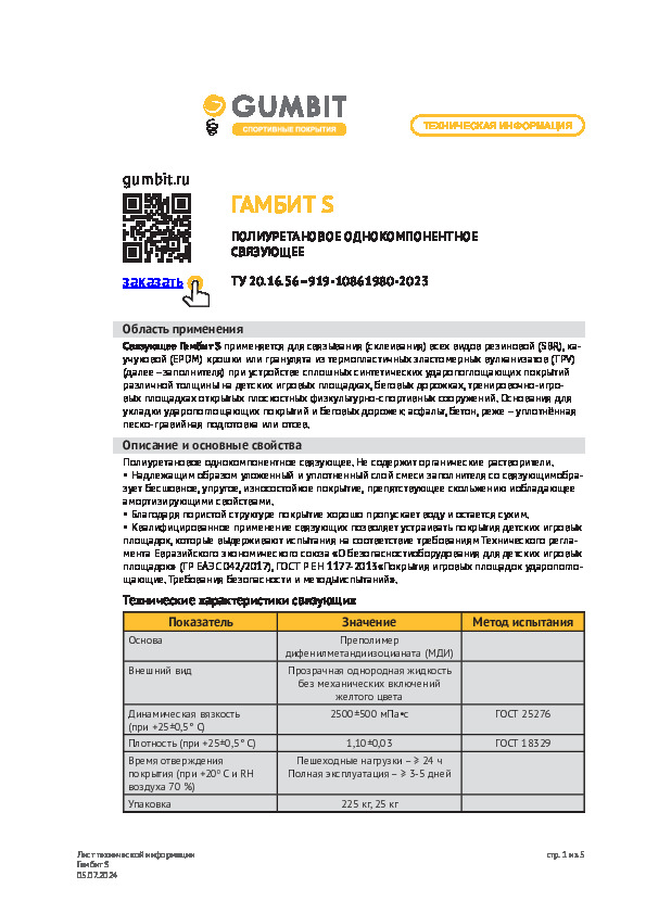 Полимерное связующее. Предназначено для создания спортивных покрытий из резиновой крошки. Хорошо взаимодействует с наполнителем даже при низких температурах — от 3 °C.